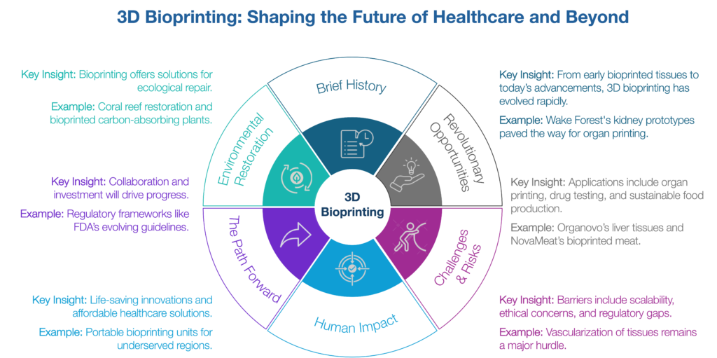 This glimpse into the future highlights how 3D bioprinting might not only alleviate existing challenges but also open doors to entirely new possibilities. By pushing the boundaries of what is possible, it offers a vision of a world that is healthier, more equitable, and better equipped to meet the challenges of tomorrow.